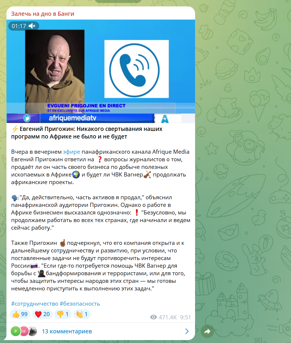 23 августа 2023 года Embraer Legacy 600 с Евгением Пригожиным на борту был взорван над Тверской областью, оставив сиротами множество многомиллиардных проектов, от «фабрики троллей» до ЧВК Вагнера. В последние месяцы перед этим все внимание Пригожина было сконцентрировано на Африке: огромный континент был окутан сетью слаженно работающих политтехнологов, наемников и добывающих компаний. В первые же недели после убийства стало понятно, что случившееся никак не повлияет на кремлевские амбиции на континенте. Руководство ГРУ в лице генералов Алексеева, Аверьянова и Евкурова начало активно обрабатывать лидеров африканских государств, объясняя им, что Россия никуда не уходит. Как показывает история рейсов пригожинских самолетов, российские наемники действительно никуда не делись с континета. Более того, как выяснил The Insider, после убийства Пригожина Кремль начал активно развивать крупный проект по дезинформации и пропаганде в Африке, под общим управлением Пятой службы ФСБ. К прежней пригожинской сетке работающих на континенте политтехнологов-пропагандистов Кремль добавил собственные ресурсы.