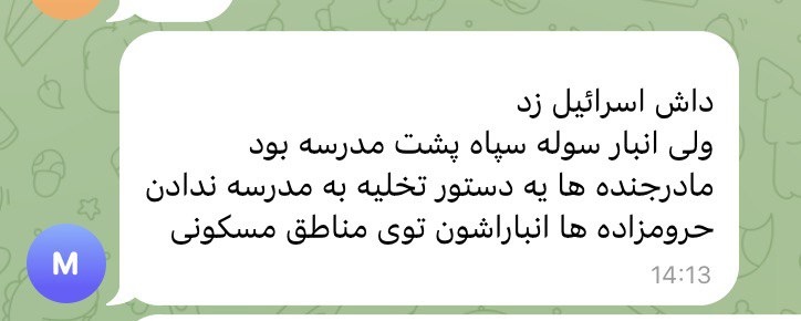 Пять минут спустя в другой группе (чат по IT-безопасности) он добавил новую деталь: удар нанес Израиль, но склад КСИР был за школой, и при этом не была дана команда на эвакуацию школы. КСИР, по его словам, держит свои склады в жилых кварталах.