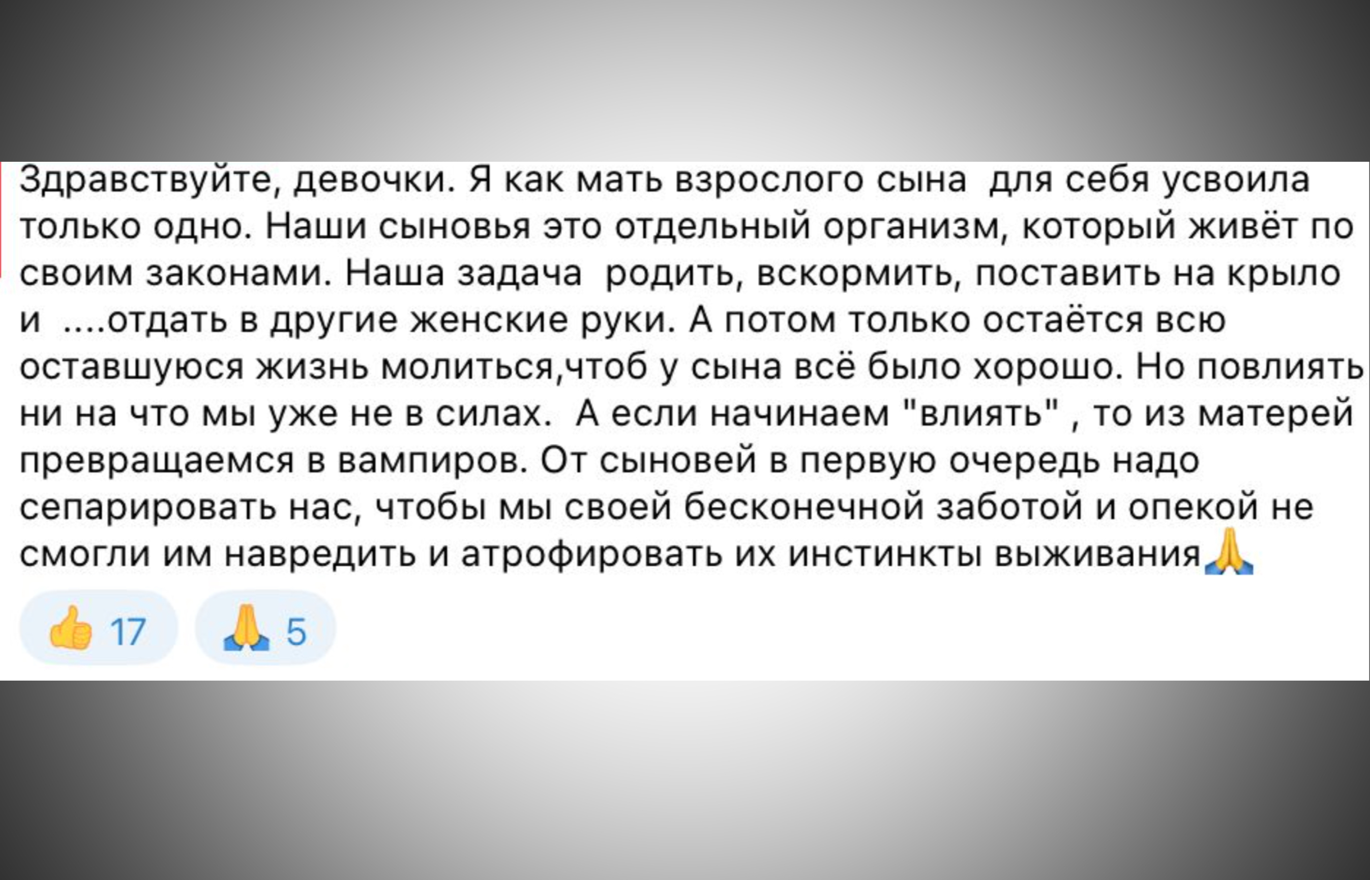 В чатах, где жены и родственники завербованных заключенных пишут о их возвращении или невозвращении с войны, также царит особая атмосфера. Скорбящие женщины радуются, если их супруги остаются живыми, и опускают подробности их биографий. О том, что те убивали людей в Украине, женщины стараются не говорить. Многие пишут про «защиту Отечества». Тех, кто поднимает вопрос о прошлом экс-заключенных, быстро затыкают другие женщины. Один из диалогов: