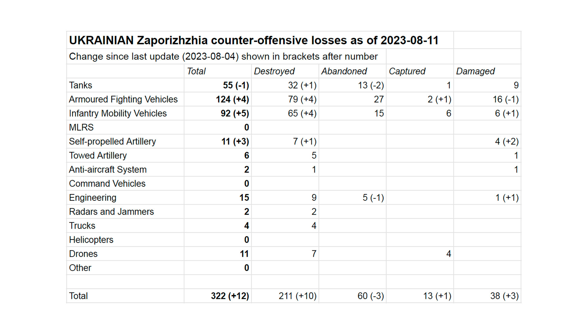 По состоянию на 11 августа 2023 года потери украинской военной техники и вооружений в ходе контрнаступления составили 322 единицы, российские — 313 единиц. Подтвержденные потери за последнюю неделю — 12 единиц у ВСУ и 14 у ВС РФ.