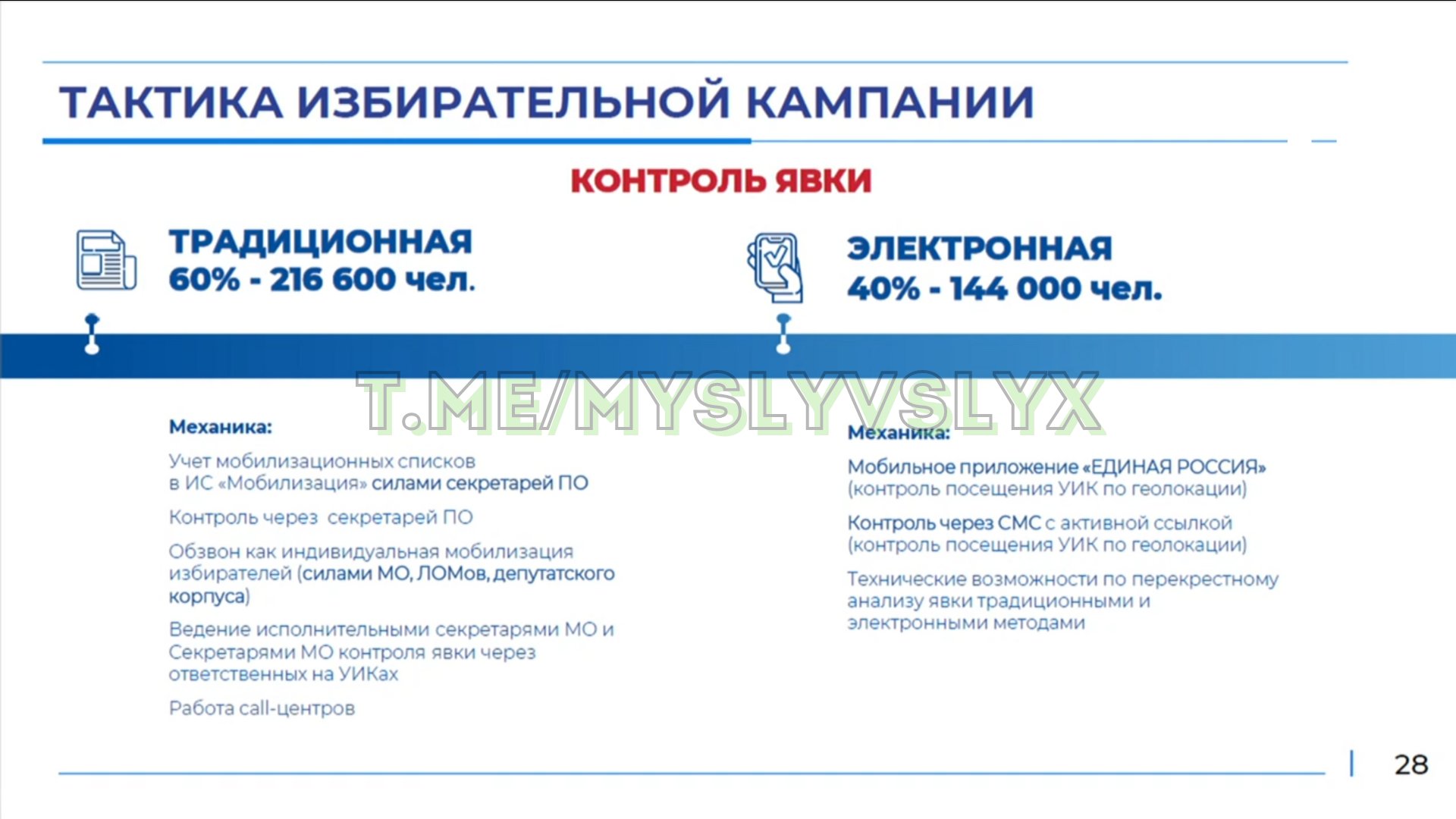 Помимо прочего, в ней говорится о контроле за посещением избирательных участков примерно 360 тысяч человек (преимущественно работников предприятий госсектора). Для этого предлагается принуждать избирателей приходить на избирательные участки, где те будут обязаны подтвердить свое присутствие. Сделать это можно будет через мобильное приложение «Единая Россия», которое будет учитывать геолокацию пользователя, или с помощью SMS.