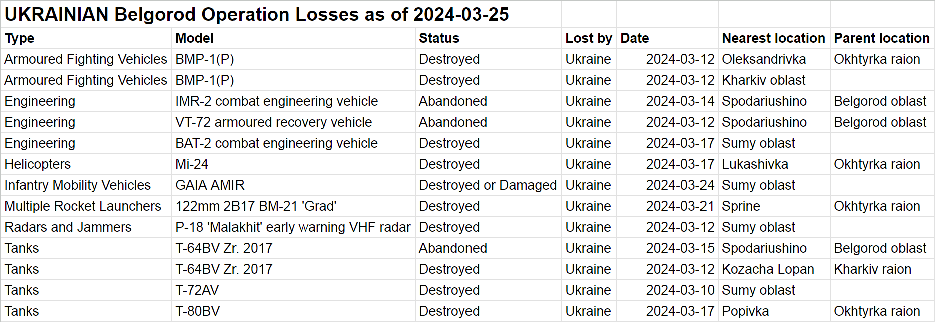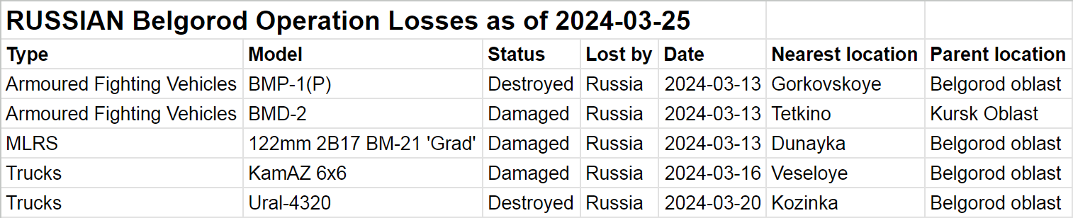 OSINT-аналитик под ником Naalsio публикует подсчеты визуально подтвержденных потерь обеими сторонами на белгородском направлении по состоянию на 25 марта.