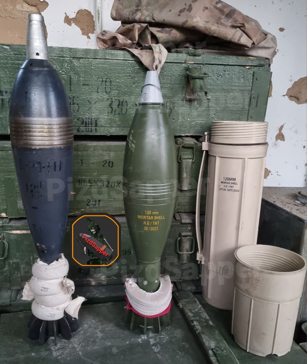 Z-канал «PizdoДельный Сапер» демонстрирует иранские 120-мм минометные выстрелы и транспортировочные тубусы для них. В описании отмечается их отличие от российских мин. В частности, они уже оборудованы пороховыми кольцами, в то время как российские приходится обматывать ими вручную.