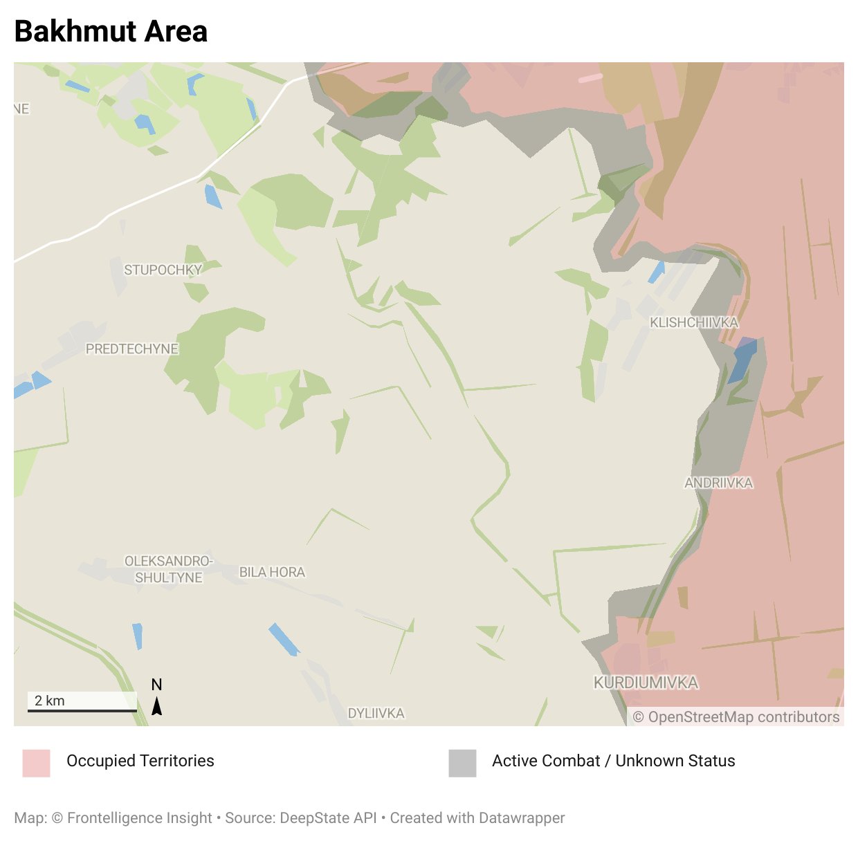 DeepState сообщает о продвижении ВС РФ рядом с Очеретино в авдеевском операционном районе, отмечаются бои в Волчанске на севере Харьковской области и Берестовом к юго-востоку от Купянска, а также в Клещеевке (южнее Бахмута), Уманском (в центре полосы наступления от Авдеевки) и Красногоровке (севернее Марьинки).