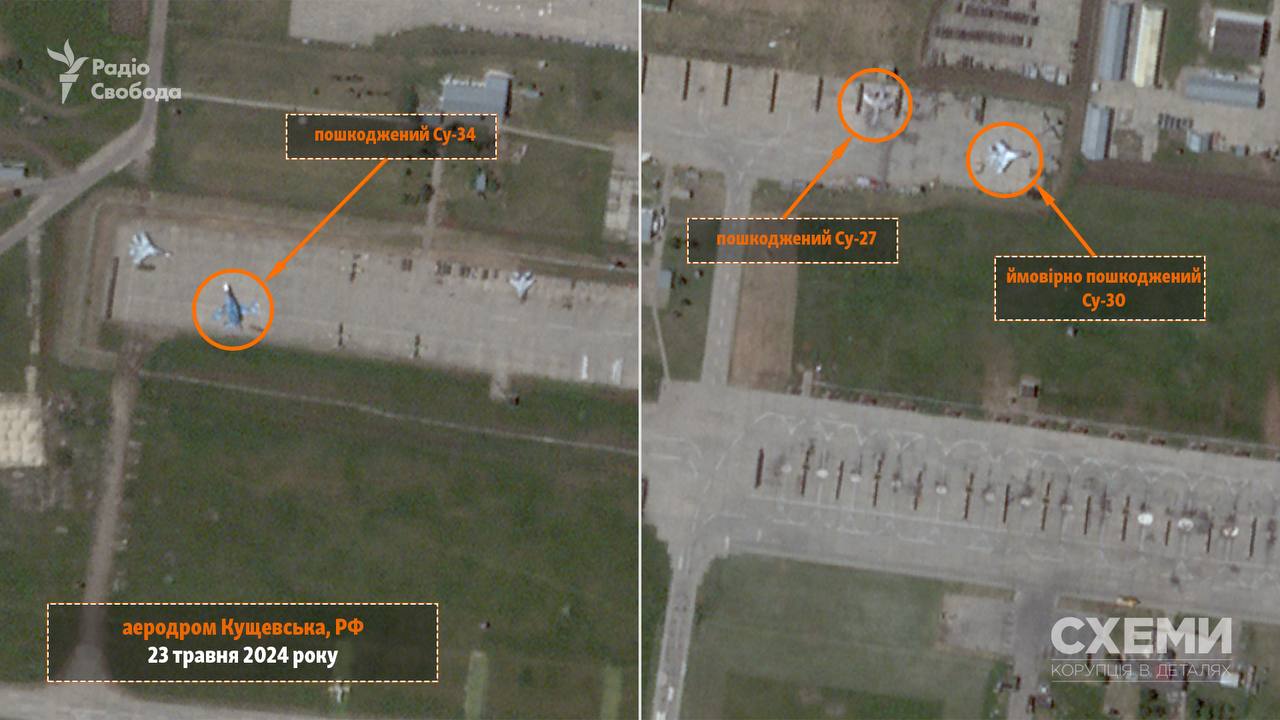 Как минимум два истребителя — Су-27 и Су-34 — были повреждены после налета в ночь на 19 мая беспилотников на аэродром Кущёвская в Краснодарском крае. Кроме того, судя по спутниковым снимкам, повреждения могут быть и у истребителя Су-30. Судя по ливрее одного из истребителей, он принадлежит к пилотажной группе «Русские витязи».