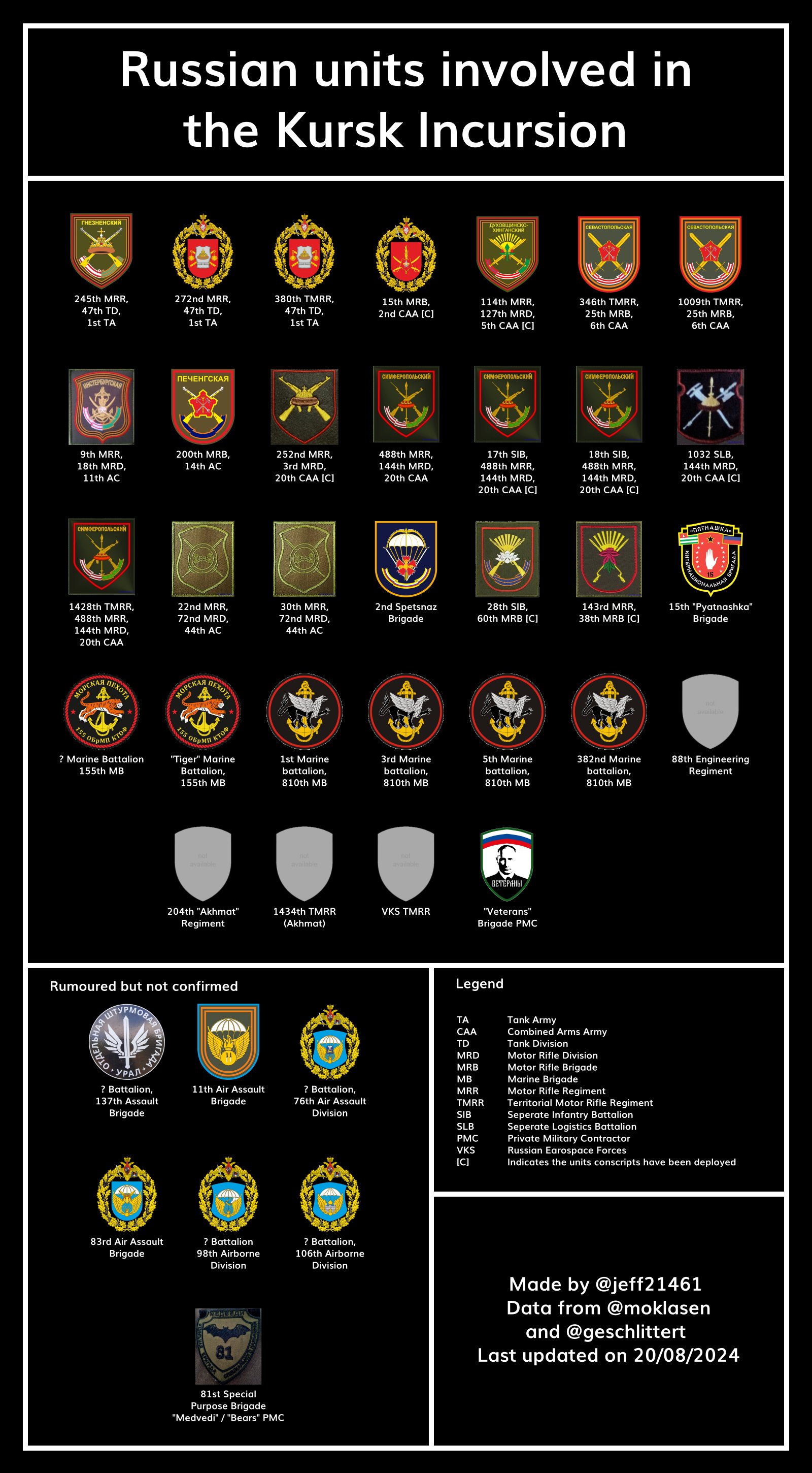 Аналитик под ником Jeff2146🇧🇪 публикует инфографику (1, 2) по подразделениям, принимающим участие в боях на курском направлении с российской и украинской стороны.