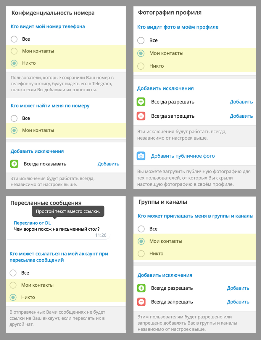 - Укажите в настройках, что никто или никто, кроме ваших контактов, не может видеть ваш профиль, если ваше сообщение будет переслано.