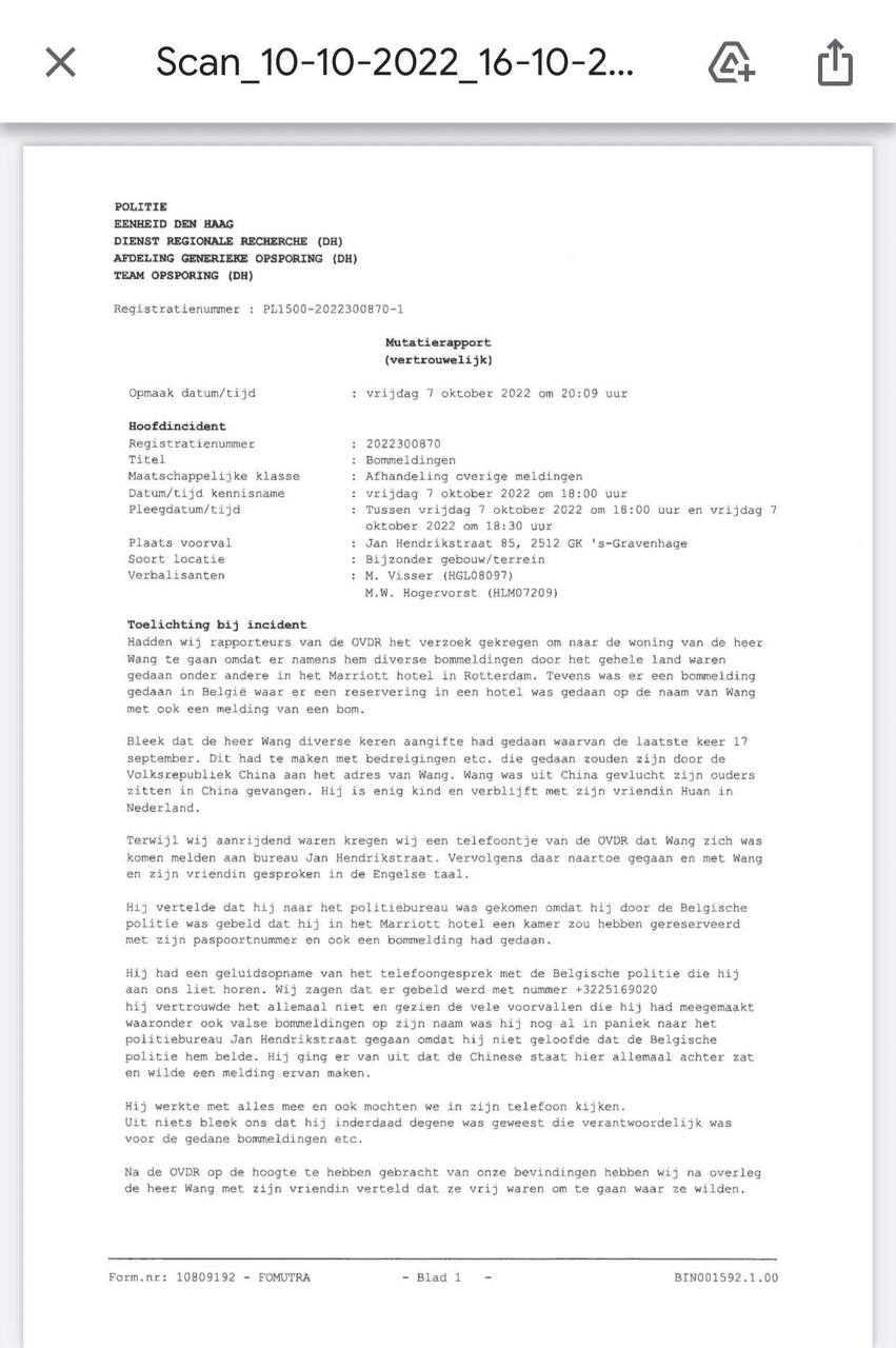 После этого голландская полиция некоторое время игнорировала звонки от «волонтеров» с «зарубежных полицейских станций», обвиняющих Вана в преступлениях. До тех пор, пока в дело не вмешались сотрудники китайского посольства — они официально вызвали полицию и обвинили Вана в посягательстве на убийство и в минировании посольства КНР в Гааге.